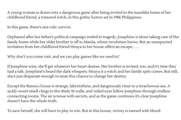 “In lush prose, Fama paints Ranoco House as labyrinthine and sinister and masterfully incorporates the backdrop of political upheaval and brewing revolution in Manila to add to the tension. The result is a wonderfully fresh take on gothic horror that should win the author a legion of fans.” —Publishers Weekly (starred review)
